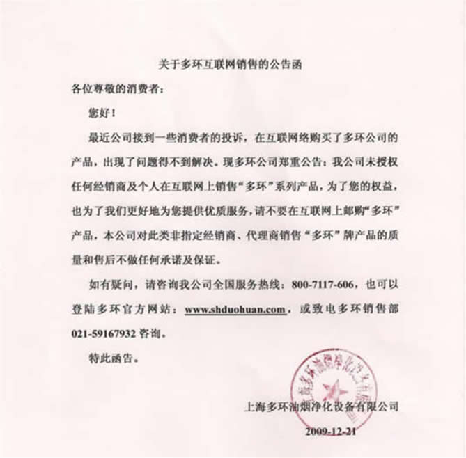 關(guān)于上海多環(huán)油煙機(jī)互聯(lián)網(wǎng)銷售的公告函